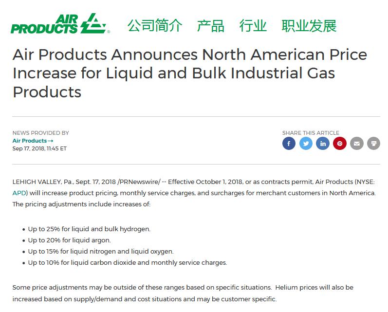 空气产品公司宣布自2019年1月1日起,或在合同允许的情况下,提高北美商家客户的产品定价、月服务费及附加费。