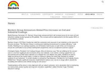 贝克斯集团宣布,将其全球主要卷材和工业涂料产品集团的价格提高8%。变更后的价格将于2019年首季度实施,或按原有合同履行合约。
