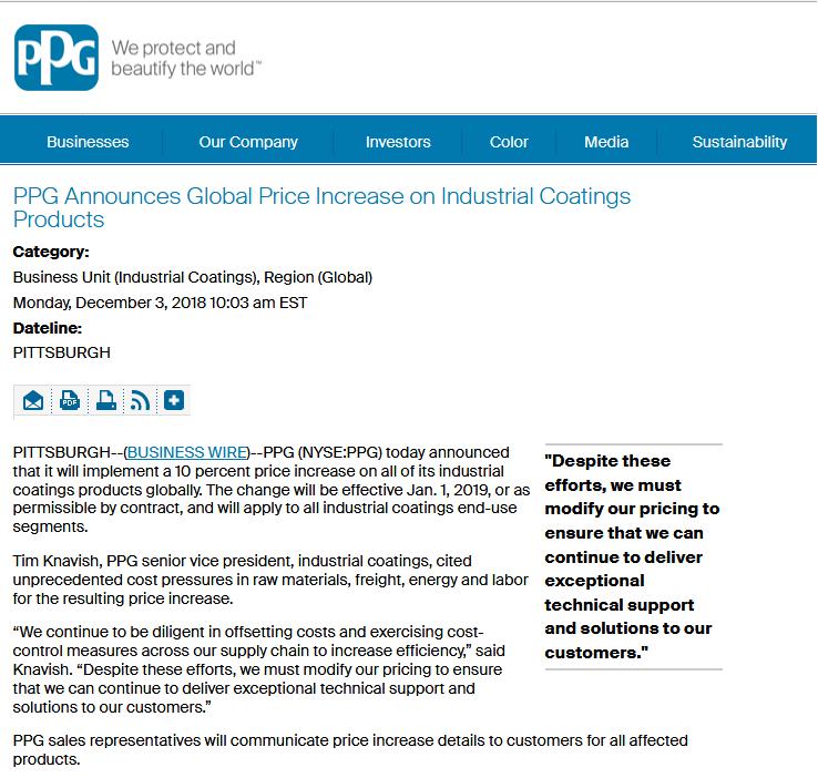 PPG宣布对其全球所有工业涂料产品实施10%的涨价。变更后的价格于2019年1月1日生效,或依照合同条款而定。