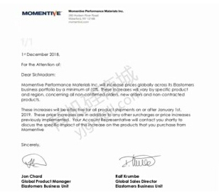 迈图高新材料宣布从2019年1月1日起,全球弹性体业务将至少提价10%!涨幅将因应具体产品和地区有所不同。
