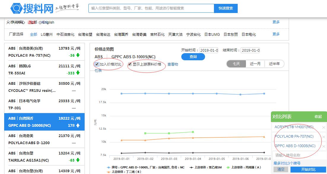 搜料网价格专题不仅收录了超3000多种材料型号的各个主流厂家价格,还有各个产品上游单体价格,同时您也可以选择其他牌号产品与当前产品进行价格比对。如果您是塑料行业的新人,搜料网可以帮助您及时了解市场价格;如果您是塑料行业专家,搜料网将和您共同把握市场。