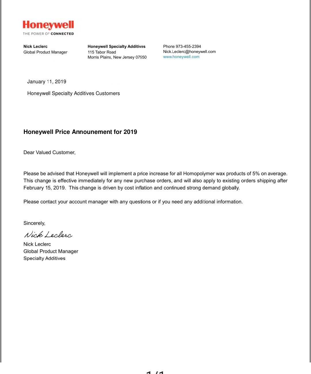 部分特殊规格产品将会有更高的增幅。新价格将于2019年2月1日起生效或参照合同条款。