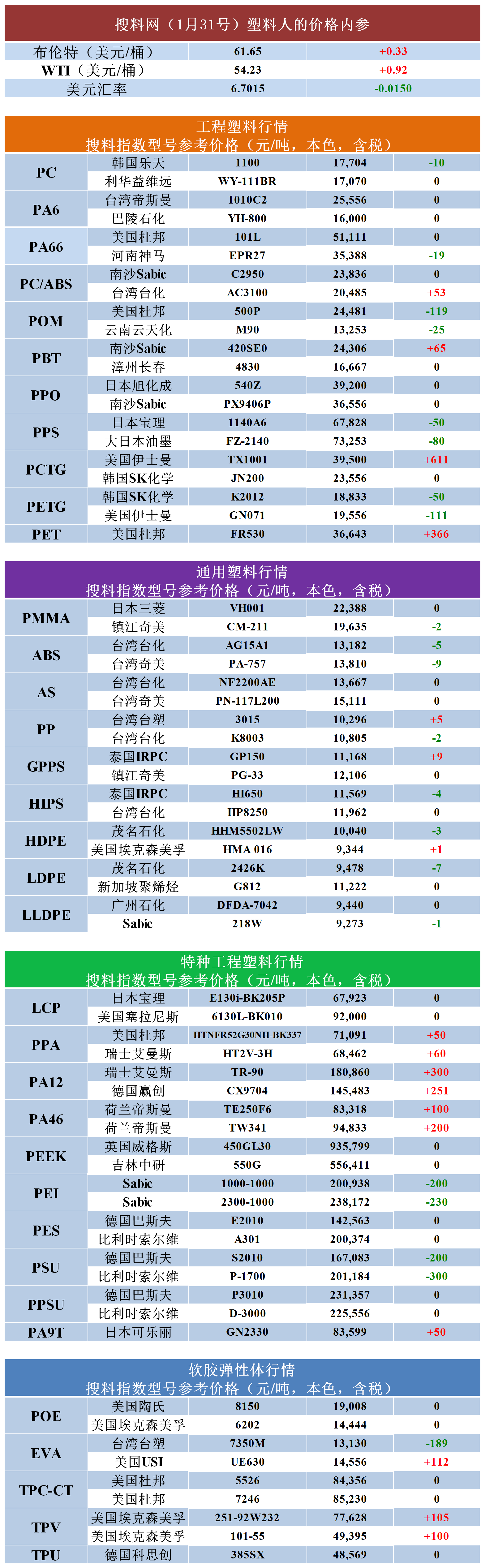 如果你想了解工程塑料其他产品价格信息,近1周、近1月、近1年、近20年历史价格,均可上搜料价格走势查询。