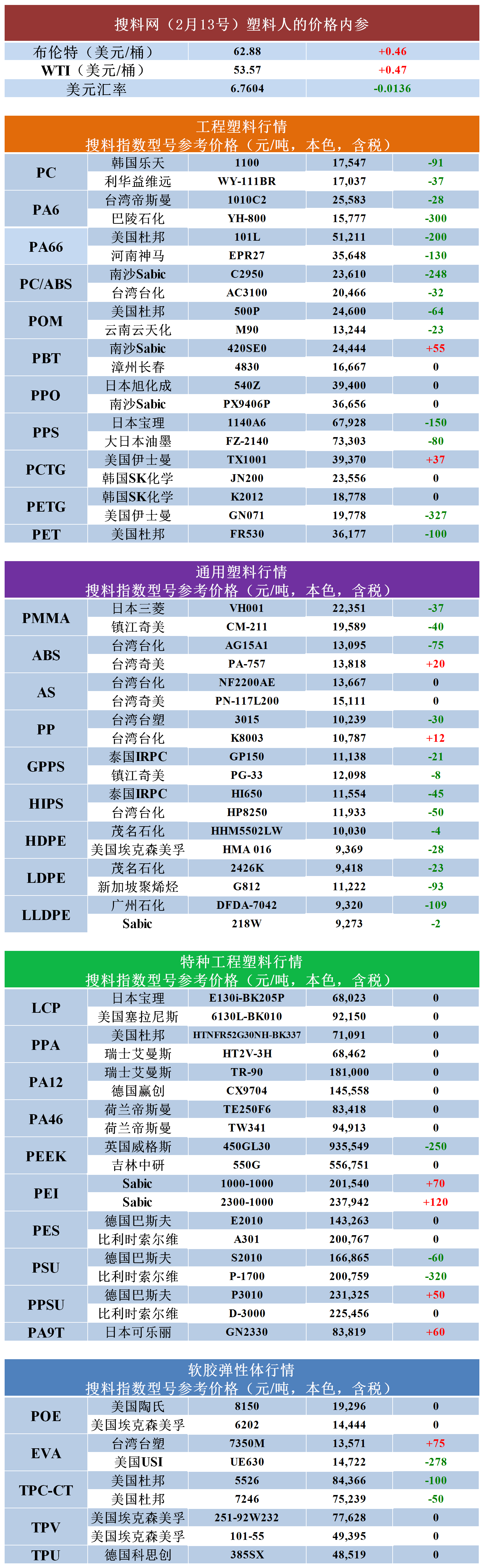 如果你想了解工程塑料其他产品价格信息,近1周、近1月、近1年、近20年历史价格,均可上搜料价格走势查询。