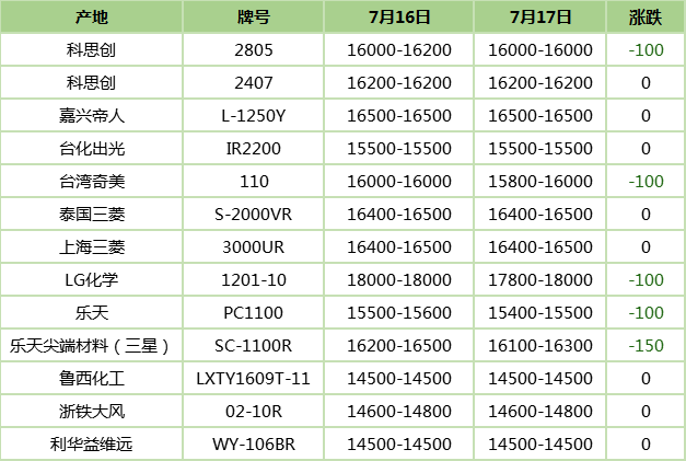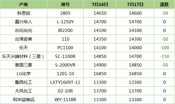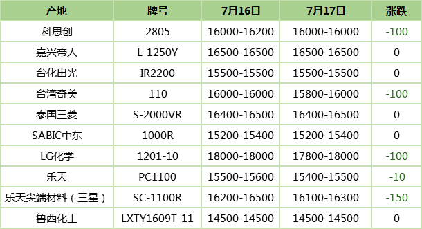 韩国乐天石化(湖石)PC装置产能10万吨/年,生产线2条。目前市场供应尚可,7月货物报盘略低于1800美元/吨附近,买盘心态尚可。