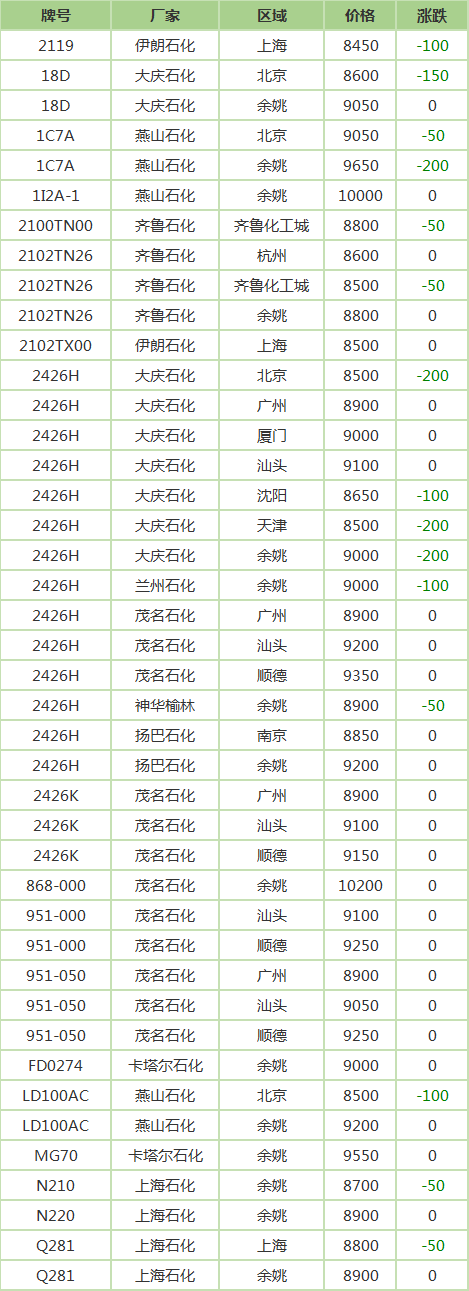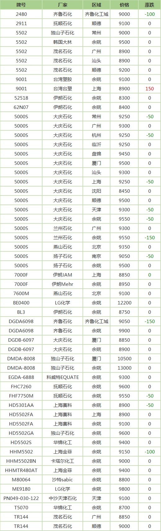已有人阅读此文 - -PE市场氛围偏弱。企业方面,两油库存下降缓慢,主力大区销售公司线性、高压及低压拉丝等开单价下调,幅度在50一150元/吨。线性期货延续弱势,现货市场交投氛围清淡,商家低报寻成交,市场成交重心下移。截止午间收盘,华北地区波幅50一150元/吨;华东地区降50一100元/吨;华南地区部分小跌50元/吨上