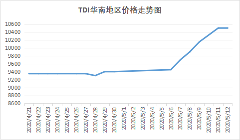 TDI市场价格在节后高歌猛进,一举突破10000元/吨。巨头5月普遍有检修计划,并表示TDI严重缺货,推动TDI持续上涨。