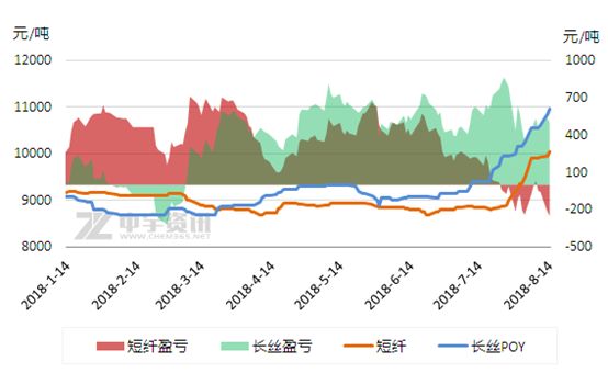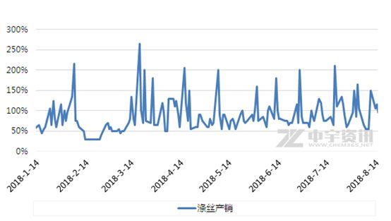 下游刚性需求稳定是支撑PTA价格续涨的主因,虽然短纤工厂因为生产亏损而开始减产,但涤纶长丝利润偏高且库存较低,涤纶长丝工厂开工较高,保证了聚酯整体开工负荷在90%左右。中宇资讯安光统计8月月均理论生产盈亏为涤纶短纤-114元/吨、涤丝POY+478元/吨。中宇资讯安光统计涤纶长丝月均产销为7月97%、8月96%,淡季不淡保证了涤纶长丝成本压力的顺利转嫁至终端工厂。2017年9-10月涤纶长丝月均产销在90%、96%左右,金九银十的传统需求旺季来临,推测2018年9-10月涤纶长丝月均产销整体稳中偏好。后期涤纶长丝工厂维系正常生产,将逐渐开始接受高价期现货PTA,助力PTA价格后期继续冲高。