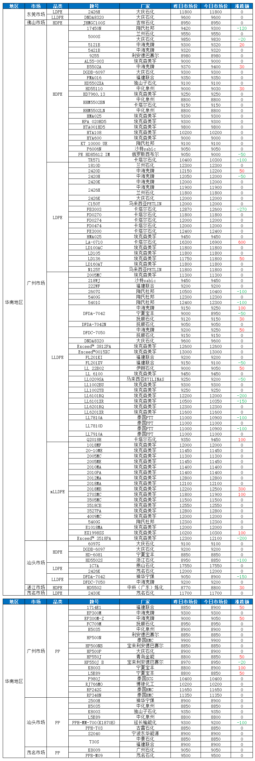 华南塑价涨跌互现!PE最高涨600,最高跌270,PP最高跌100!(20220530)