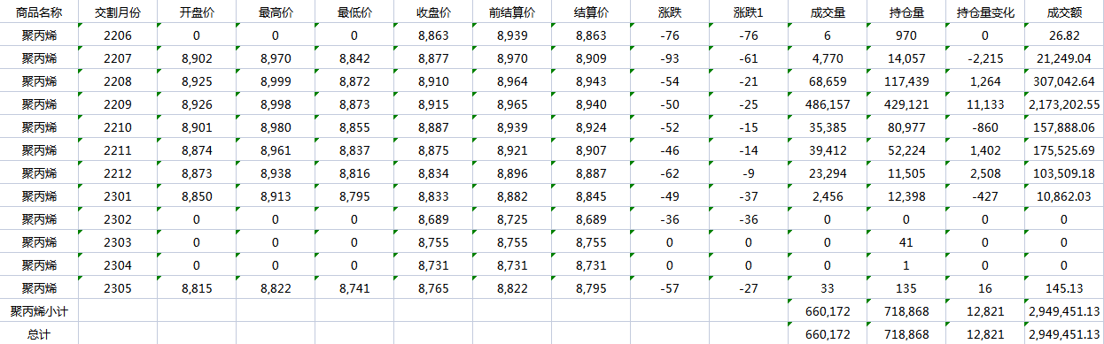 大连商品交易所6月21日PP行情表