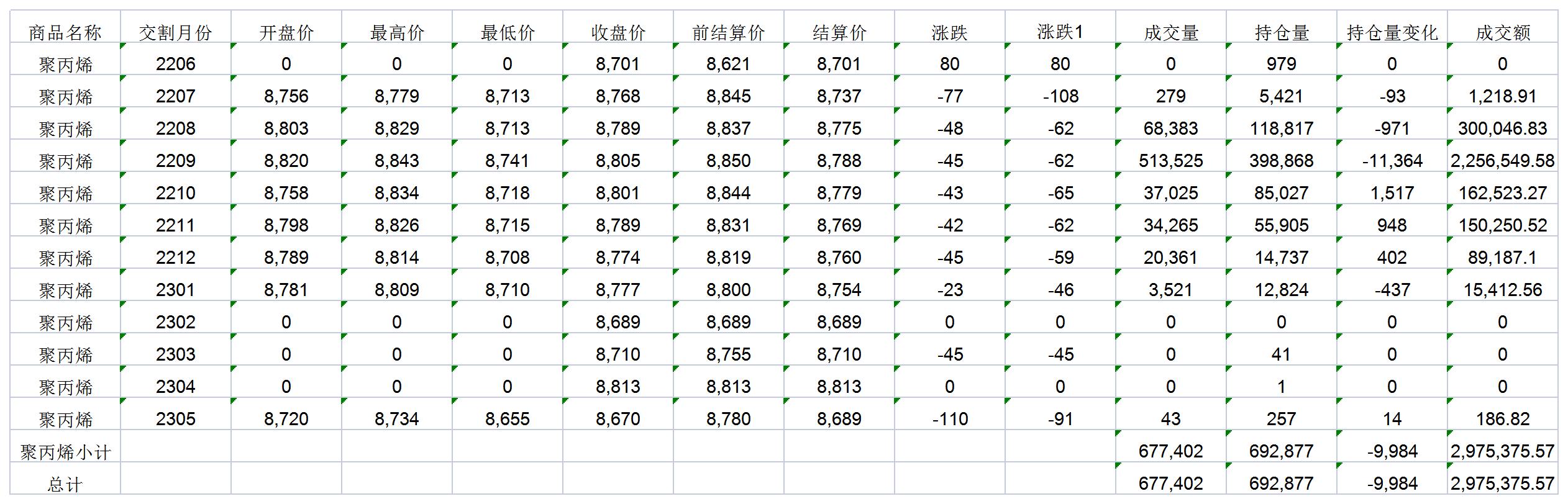 大连商品交易所6月21日PP行情表