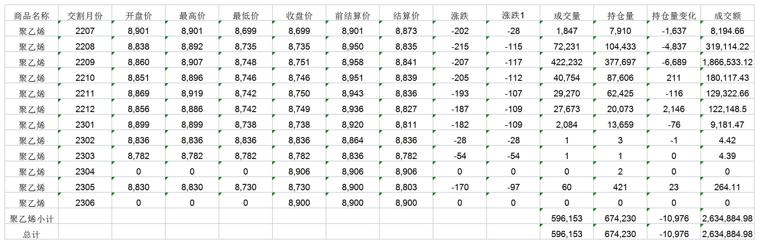 大连商品交易所 日行情表 查询日期:20220621 本月第14个交易日 本年第110个交易日 说明: (1)价格:自2019年12月02日起,纤维板报价单位由元/张改为元/立方米 (2)价格:元/吨,鸡蛋为元...
