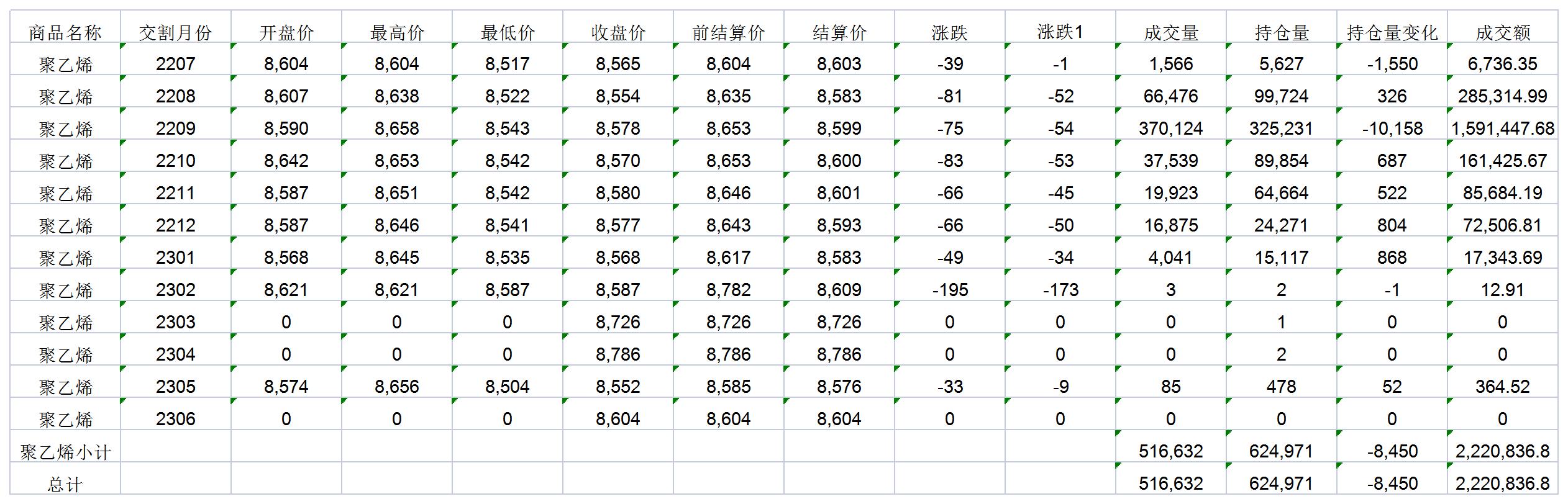 大连商品交易所6月21日PP行情表