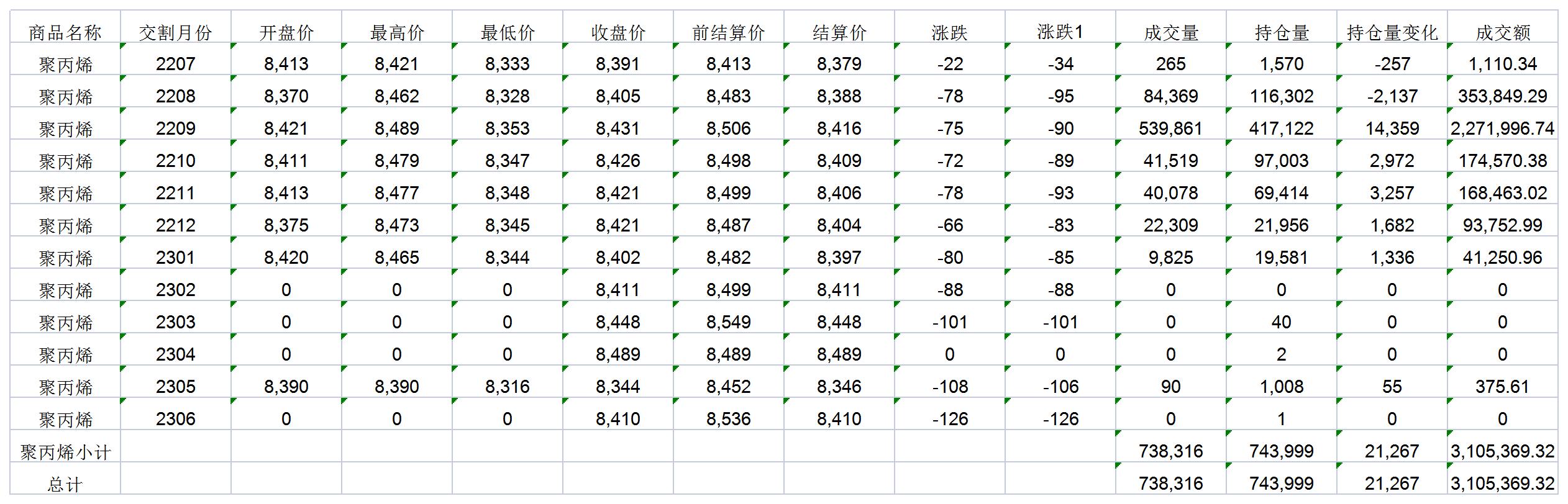 大连商品交易所 日行情表 查询日期:20220622 本月第15个交易日 本年第111个交易日 说明: (1)价格:自2019年12月02日起,纤维板报价单位由元/张改为元/立方米 (2)价格:元/吨,鸡蛋为元...