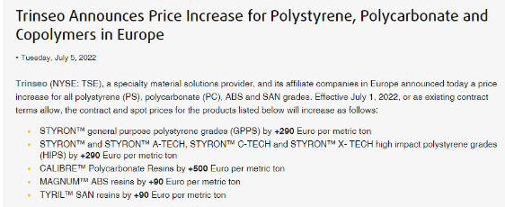 7月5日,盛晓再次宣布,从7月1日起,将提高其PS、PC、ABS和San系列产品在欧洲市场的价格,具体涨幅如下: STYRON 通用级聚苯乙烯(GPPS)+290欧元/吨(约合人民币1983元); STYRON、STYRON...