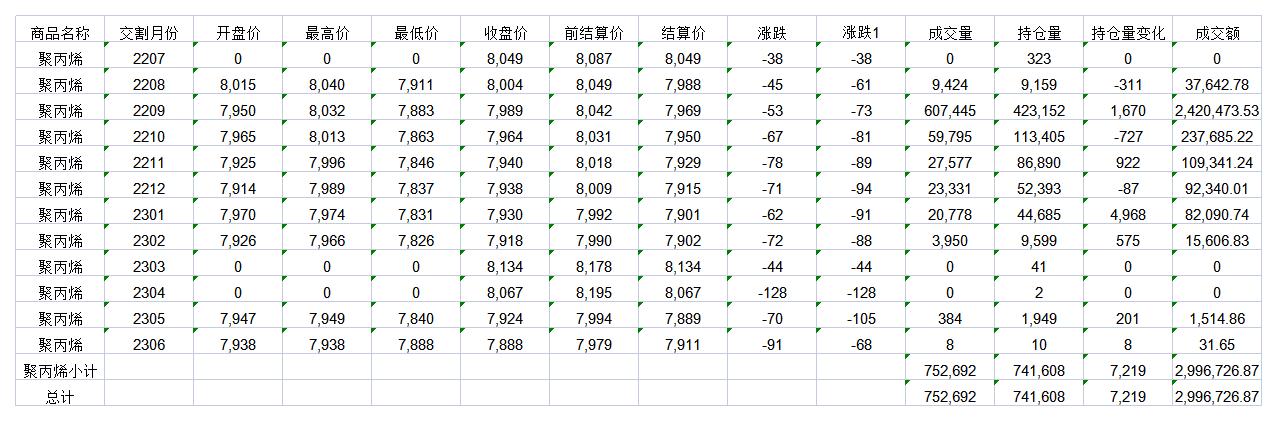大连商品交易所 日行情表 查询日期:20220707 本月第5个交易日 本年第122个交易日 说明: (1)价格:自2019年12月02日起,纤维板报价单位由元/张改为元/立方米 (2)价格:元/吨,鸡蛋为元...