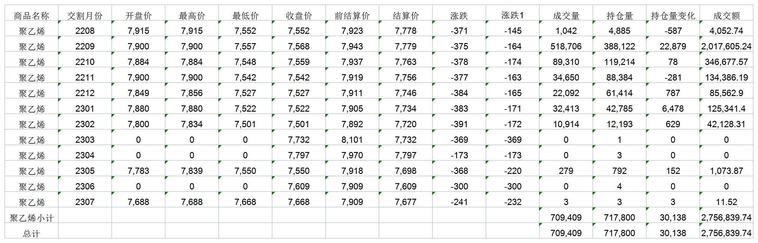 大连商品交易所 日行情表 查询日期:20220715 本月第11个交易日 本年第128个交易日 说明: (1)价格:自2019年12月02日起,纤维板报价单位由元/张改为元/立方米 (2)价格:元/吨,鸡蛋为元...