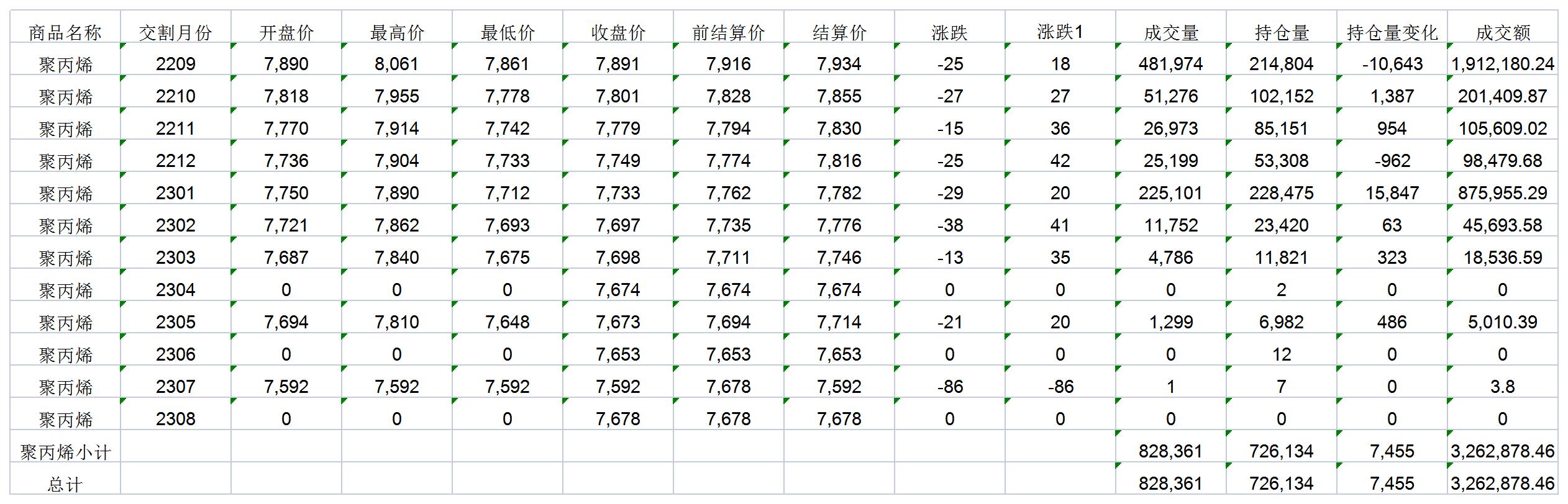 大连商品交易所8月8日PP行情表