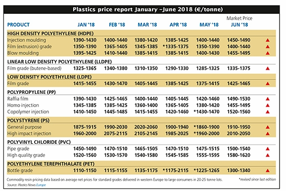 已有人阅读此文 - -6月份,原料成本上涨导致标准热塑性塑料价格大幅上涨。聚合物价格上涨要么与成本上涨相匹配,要么在大多数情况下,与成本上涨相比有所下降。然而,对于PP共聚物和瓶级PET而言,由于供应紧张,价格上涨甚至高于成本上升。