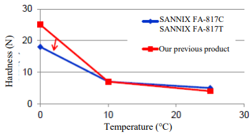硬度:与以前的产品相比,低温下的硬度下降了约30%。如果假设25℃时的硬度为1,那么以前的产品和新产品在0℃时的硬度分别为5和3.6)。