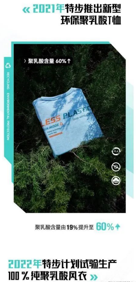 自推出聚乳酸产品,特步不断在产品中增加可降解材料的使用。2021年,特步推出了新型环保聚乳酸T恤。