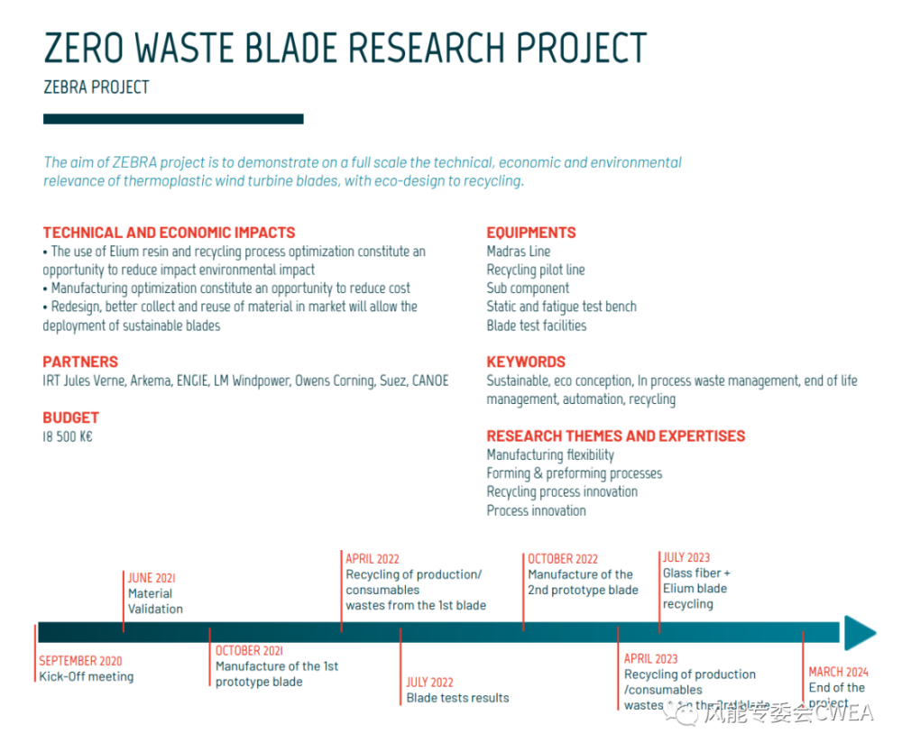 ZEBRA零废叶片研究项目于 2020 年 9 月正式启动,由法国凡尔纳国际研究中心(IRT Jules Verne)领导发起,该组织汇集了包括阿科玛、CANOE、Engie、LM Wind Power、欧文斯科宁和 SUEZ 在内的多家工业公司。项目预算超过1850万欧元。