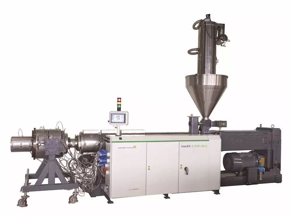 这台leanEX 2-93R-28-CL平行面双螺杆挤出机,是最大生产量达580KG/钟头的高生产量系列产品,也是管材挤出中取得成功的交钥匙leanEX系列产品的拓宽。