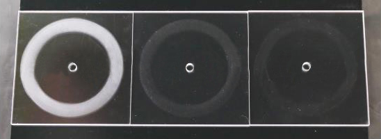 该图为PC树脂表层耐磨损耗实验(1000转)后的刮痕较为。(左:无镀层;中间:湿试法;右:低温等离子CVD法)