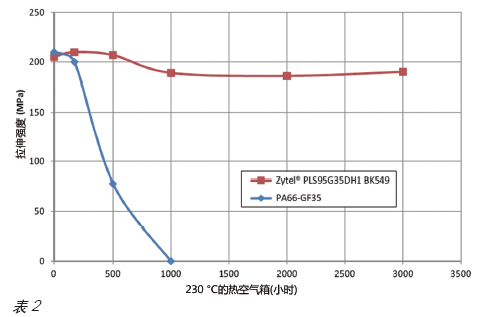 在180℃的脆化温度下,传统式的平稳级别在3000小时后丧失其抗拉强度的约一半(从210MPa 减少至105MPa)(等同于车子行车约150,000 千米),而PLUS 级别在同样温度下基本上沒有劣变的征兆(表2)。在210℃的脆化温度下的较为(其越来越愈来愈变成汽车产业中的关键性要素)差别更为清晰。在这类状况下,标准级在约800小时后失去其抗拉强度的一半,而PLUS级在其抗压强度低于其初值的一半以前承受该温度超出3000钟头。 在这个环节,标准级基本上彻底炭化。