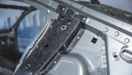 宝马7 系列产品的碳纤维材料块状模塑胶提高C 柱(图片由宝马汽车公司出示)。