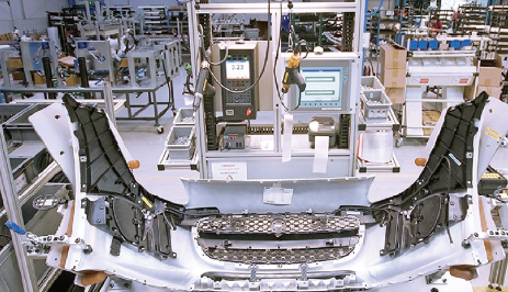 坐落于美国布罗姆亚德的POLYTEC 企业的捷豹F 型前保险杠的智能化安装站。保险杆由提高反映注入成形聚氨酯材料做成(图片由POLYTEC集团公司出示)。