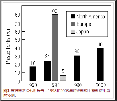 自20世纪80年代中期以来,汽车制造商已经用塑料替代涂层钢罐。在1993年的模特年份,在北美建造的大约270万辆汽车和卡车使用了非金属坦克。这相当于1990年的16%。相比之下,欧洲市场使用70-90%的塑料储罐,而日本市场则使用5%塑料储罐。