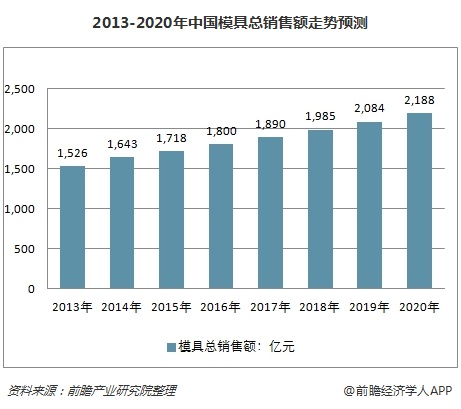 据前瞻产业研究院发布的《中国模具行业发展前景预测与投资战略规划分析报告》数据显示,我国模具制造厂点约30000家,从业人员约100万人。2016年全国模具总销售额达到了1800亿元。2013年至2015年,我国模具总销售额的年均复合增长率达到 6.1%。预计2018年全国模具总销售额及将接近2000亿元,预计到了2020年全国模具总销售额将达2188亿元。