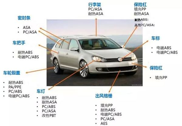 使用的塑料材料包括聚丙烯、聚乙烯、聚氨酯、尼龙、ABS、聚碳酸酯以及纤维增强复合材料等。应用在乘用车中的塑料部件占车身总重量的比例平均已经达到8%~12%,但应用于外饰件的比例仅占车身总重的1%~2%。