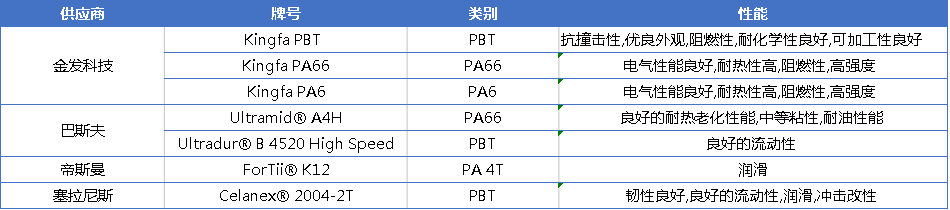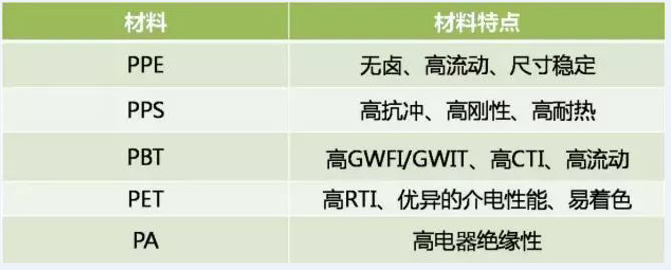 电器连接件如继电器、高压接插件等都需要添加阻燃材料,这是基本要求。接插件金属端子需要插拔次数多,还要求寿命要长,以免老化断裂耐热。目前常见的材料主要有PBT、PA等材料。
