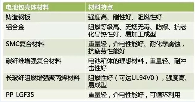 电池包壳体一般可以采用:铸造钢板、铝合金、SMC复合材料、碳纤维增强复合材料、长玻纤阻燃增强聚丙烯材料、PP-LGF35等。塑料壳体具有较好的成本优势以及综合性能,是目前发展动力电池壳体的主要发展材料。在对动力电池提出了明确的阻燃要求后,越来越多的企业如中航锂电、博世、雷天等,开始采用阻燃塑料做电池壳体。
