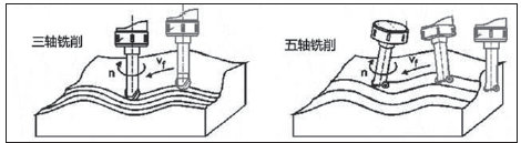 5轴连动加工是根据在目前的3 个笛卡儿平行线纵坐标上集成化2个额外的晃动回传动轴来完成的(图1),使车刀以五个可玩性相对性于预制构件的随意表层开展5轴连动加工,针对一些较深或难以贴近的凹模随意斜面(图2),凭着5轴加工就能采用相对性短的车刀(图3),提高车刀的刚度和提升车刀加工的可靠性。