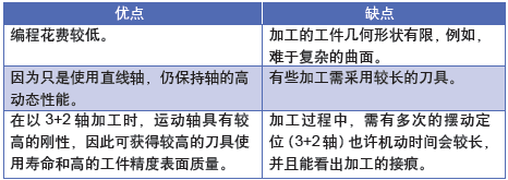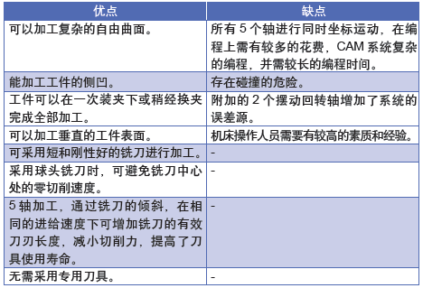 表1. 5 轴连动铣削相对性于3 轴铣削的优、缺陷