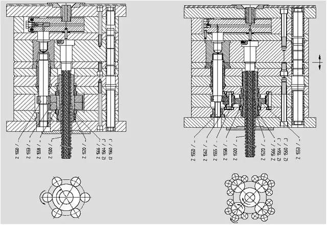 ② 螺纹型芯旋转另外倒退,商品当然摆脱。