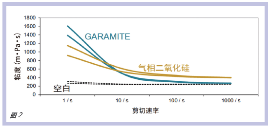 GARAMITE®所展现的流变性曲线图是低裁切率下的低粘度和高剪切率下的高粘度特性。它具备2个优势:第一是低裁切率底下高些的妥协值, 因而主要表现出高些的抗流挂性和更强的顆粒飘浮性能(抗地基沉降性)。第二是高剪切率下的高粘度,更便于工程施工运用(图2)。