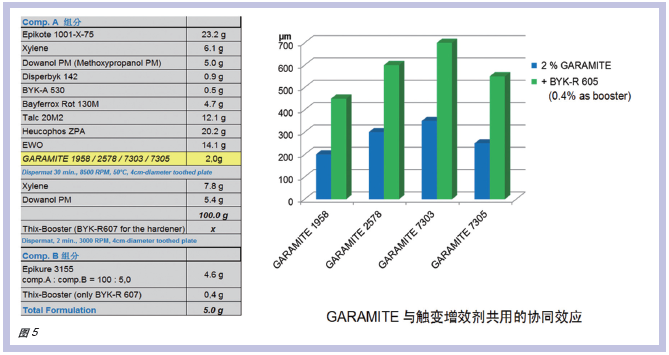 c) 对一些规定高些触变性能的运用场所,可运用GARAMITE®与触变增效剂同用时造成的协同作用得到。能够依据具体运用选装种类与使用量,为工程施工产生便捷(图5)。