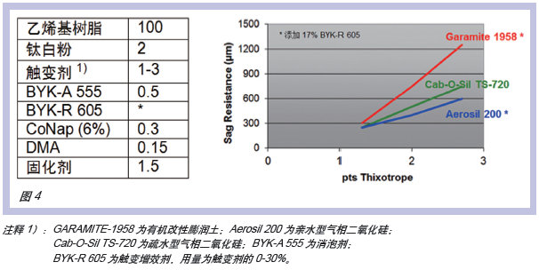 不一样类型的触变剂在乙烯基树脂中的性能主要表现不一。对于此事选用以下秘方开展比照评定(图4):