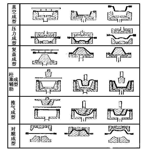 将截成一定规格和样子的塑料塑胶板材夹在模具的架构上,让其在Tg~Tf间加温变软,随后凭着释放的工作压力使其紧靠模具型面,获得与型面差不多的形样,制冷定形和整修后即得产品的成型方式。