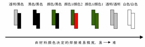 激光器塑料焊接在其中的一个课题研究便是2个被焊接构件的色彩搭配,它是由所选用的激光器散射焊接的基本原理所决策的。下面的图显示信息了因原材料色调的不一样而导致的焊接难度系数水平。最先取得成功完成的是半透明�C灰黑色原材料的激光器焊接。此外灰黑色�C灰黑色原材料的焊接也已普遍应用。