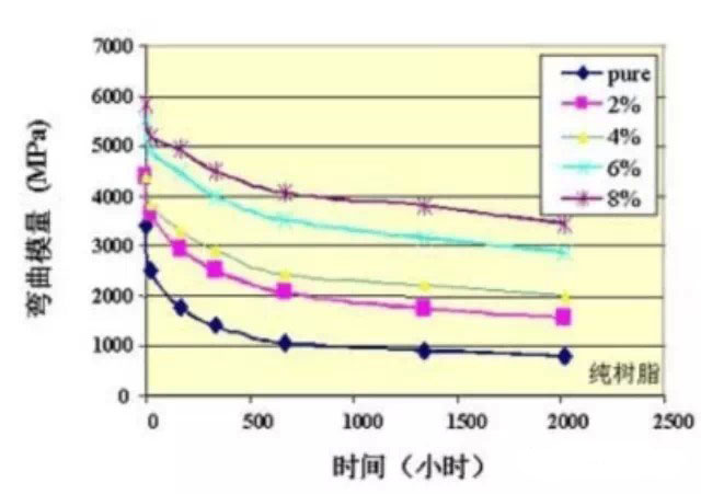 之上纳米技术高分子材料方式在缓减吸水速率、减少吸水量的另外,在非常大水平上还改进了尼龙6/66因吸水产生的不良影响。如涤纶蒙脱土纳米技术高分子材料吸水后,物理性能的降低和规格转变要低于纯涤纶。另一方面,上文引入的这种共混和无机物纳米技术复合型的报导在物理性能上均得到改进,如Tg、应变速率的提升这些,即使吸水以后物理性能有一定的下降,下降的力度也远远地低于添加蒙脱土后所提升的力度。下图是不一样成分的蒙脱土的尼龙6原材料,置放一段时间后弯曲模量产生的转变,从图上能够看得出,即便是2%蒙脱土的加上量,在做到饱和状态吸水率后,弯曲模量也会高于纯尼龙6许多。
