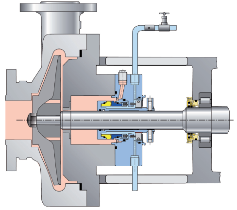图2. 将水引入到机械密封的“急冷”口,这种水使密封面维持制冷和润化,最终从“排污”口排出来。