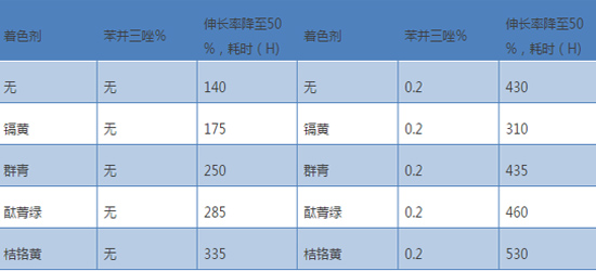 表 2不一样着色剂对含苯并三唑的髙压聚乙烯薄膜的光稳定性的危害