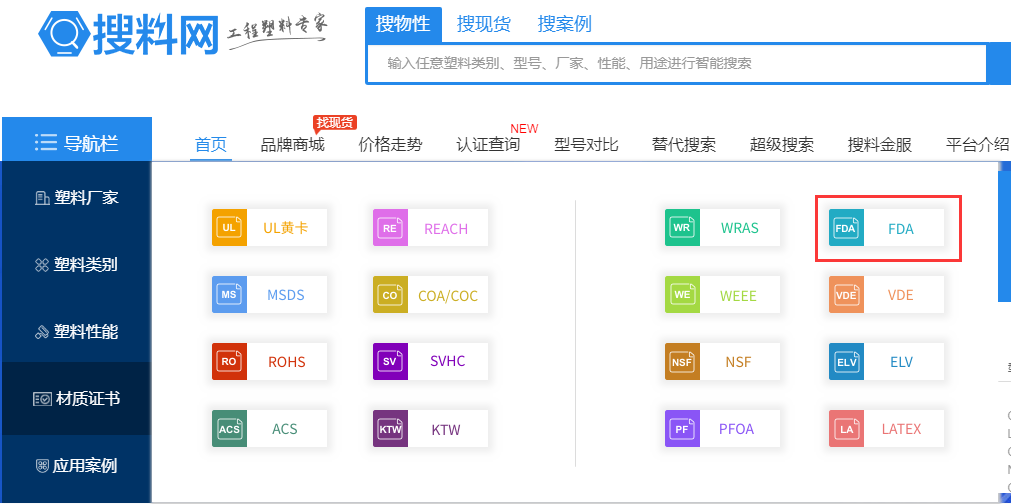 因此,国际很多厂商都以追求获得 FDA 认证作为产品品质的最高荣誉和保证。如果您想查询现在所用的产品或者材料是否具备FDA认证,就上搜料网。