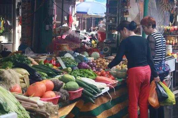 菜市场内,消费者拎着五颜六色的塑料袋在买菜