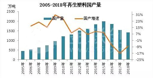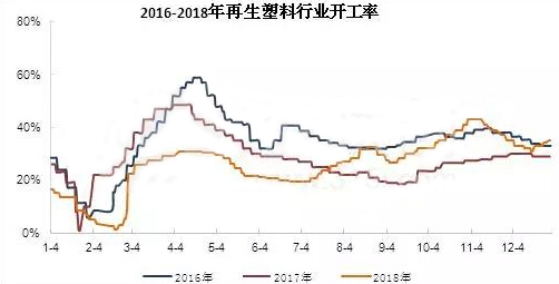 近几年再生塑料行业在政策影响下,开工率一直在低位水平。2017年,新一轮政策收紧初期,对市场开工率影响较大,全年综合开工降至3成左右。尽管2018年在环保常态化,及企业环保意识提高后,下半年环保型企业增加,部分市场园区逐渐规范,行业开工率随之缓慢提升,2018年综合开工率在3-4成,但仍不及往年5成以上的开工率水平。
